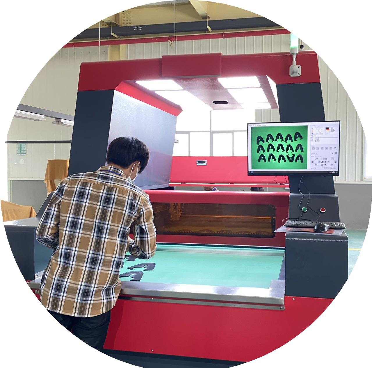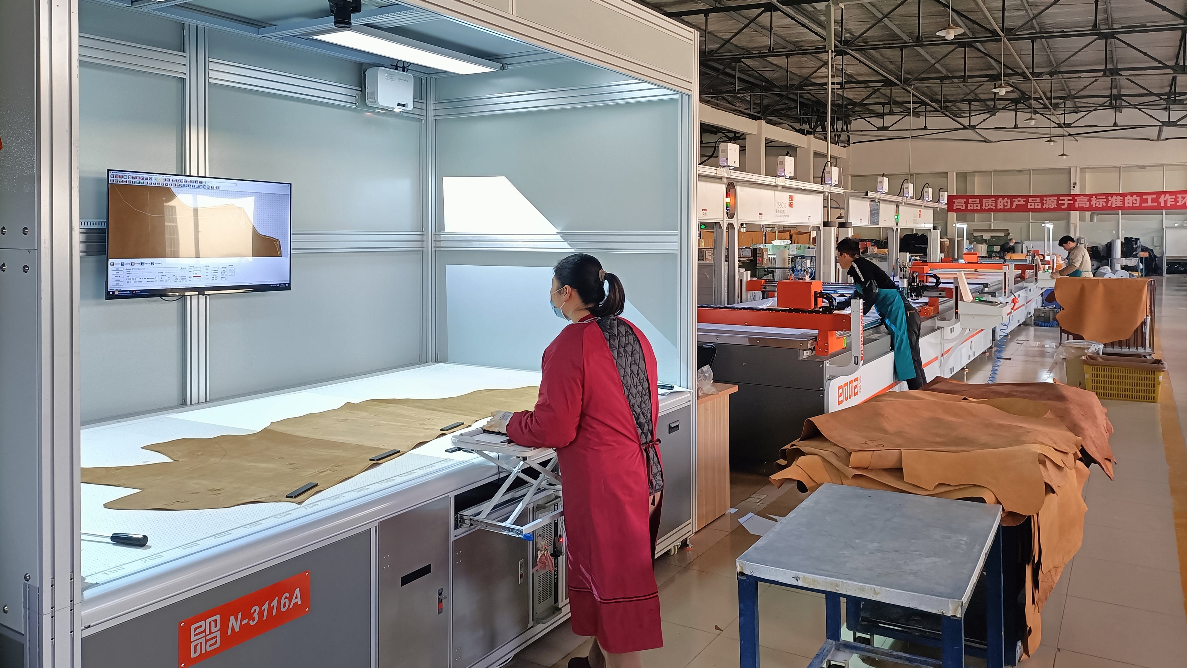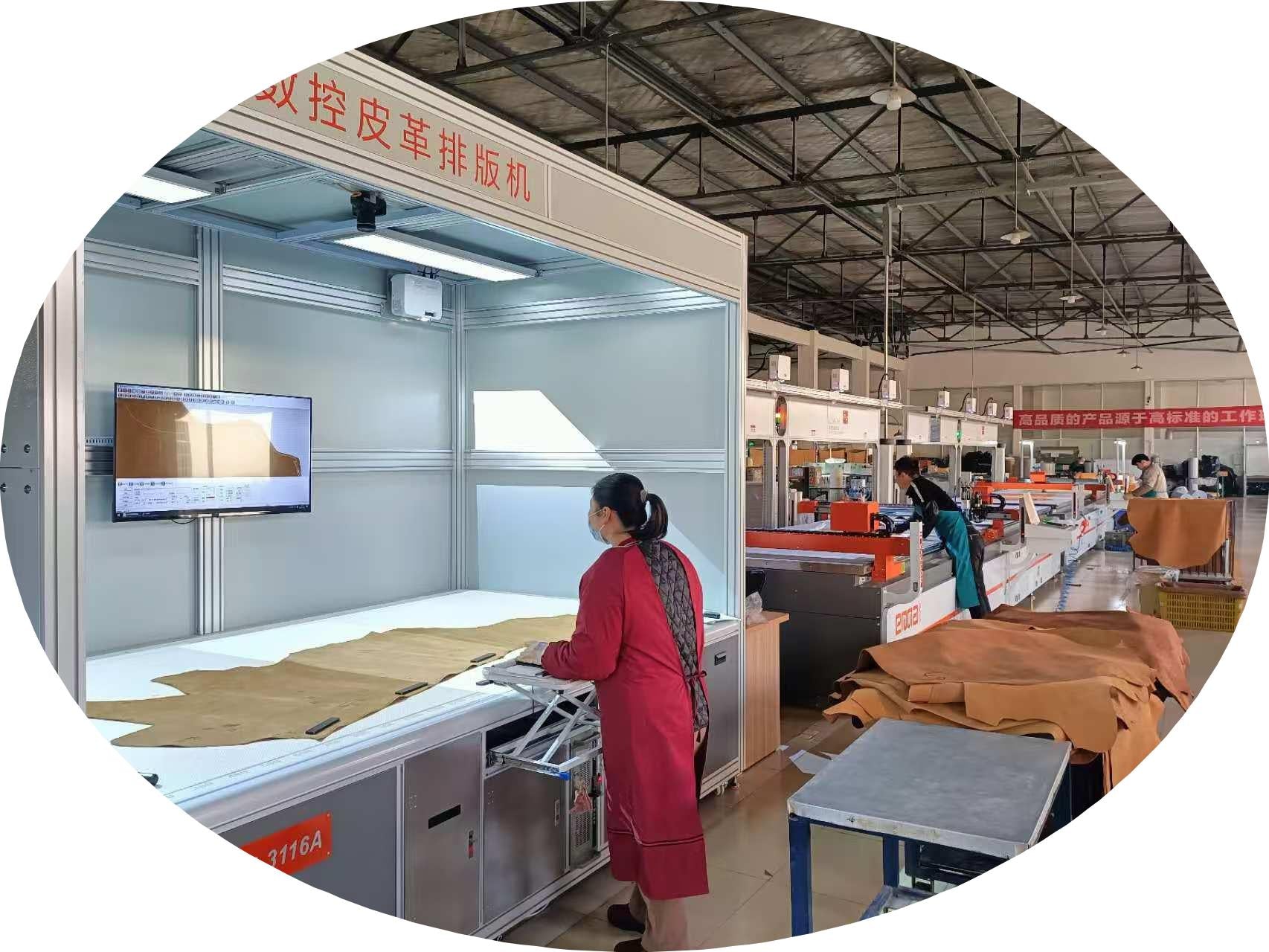 This equipment is used for cutting leather with automated technology, helping to save materials and labor costs.